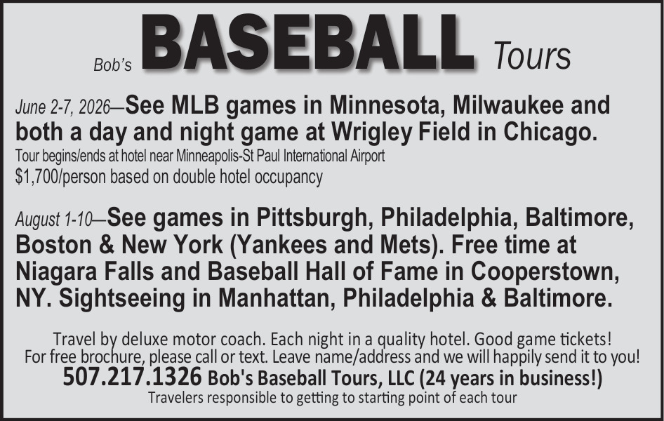 Ads for Bob's Baseball Tours, LLC in Redwood Falls, MN