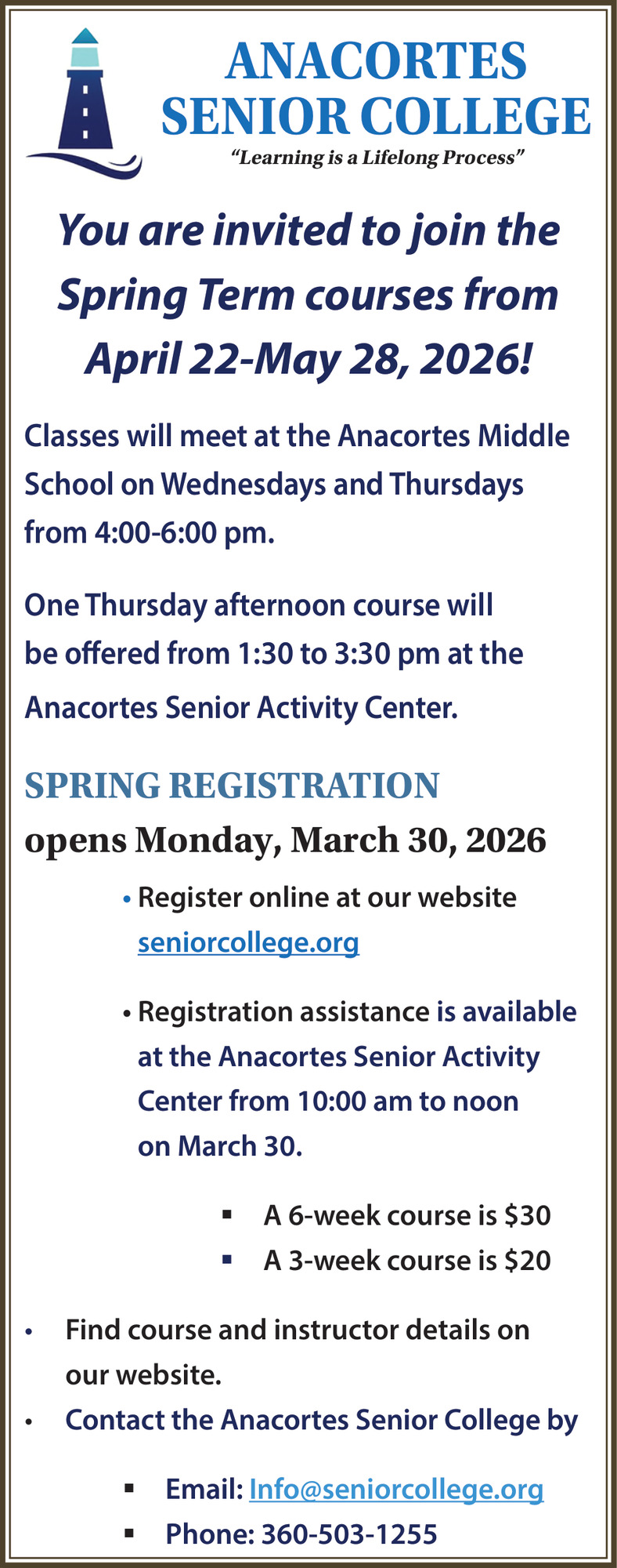 Mar 18, 2026. Anacortes Senior College Education Ads from GoAnacortes