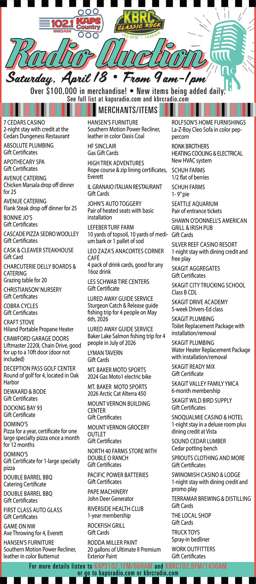 Apr 09, 2026. KBRC Classic Rock Auction Ads from GoSkagit
